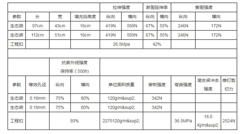 生態(tài)袋具有優(yōu)異的物理及化學(xué)性能,是用一種無紡織的土工布料(主要成份是由特殊配方生產(chǎn)的高分子聚合物---聚丙烯)針刺成網(wǎng)的高強(qiáng)度平面穩(wěn)定的材料,根據(jù)土工合成材料研究所(GRI)作的4個(gè)加速實(shí)驗(yàn),在25℃的水氣界面,施加260kPa 壓力,本系統(tǒng)PP的工程強(qiáng)度壽命超過120年;當(dāng)本系統(tǒng)生態(tài)袋按規(guī)范安裝且完全覆蓋后,壽命可達(dá)200年以上。這種特殊配制的材料可以抵抗紫外線的侵蝕,不受土壤中化學(xué)物質(zhì)的影響,不會(huì)發(fā)生質(zhì)變或腐爛,永久不可降解并可以抵抗蟲害的侵蝕,抗老化,無毒,抗酸堿鹽侵蝕及微生物分解,只透水不透土、對植物友善又可植被綠化;作為最新型邊坡構(gòu)件材料具有下述環(huán)境普適性優(yōu)勢: